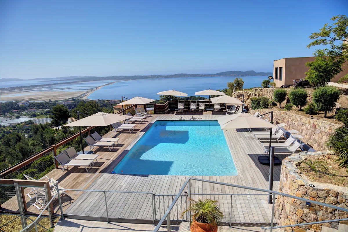 Située à Hyères, la propriété Les Cistes offre une vue mer spectaculaire à 180° dans un environnement privilégié, à proximité de la plage de l’Almanarre et de la Presqu’île de Giens.