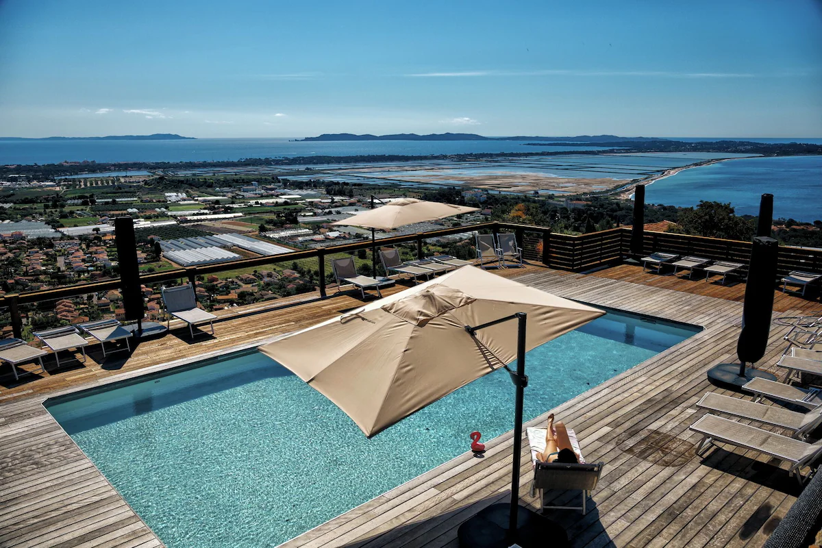 - Terrasse en bois de 200 m² avec bains de soleil
