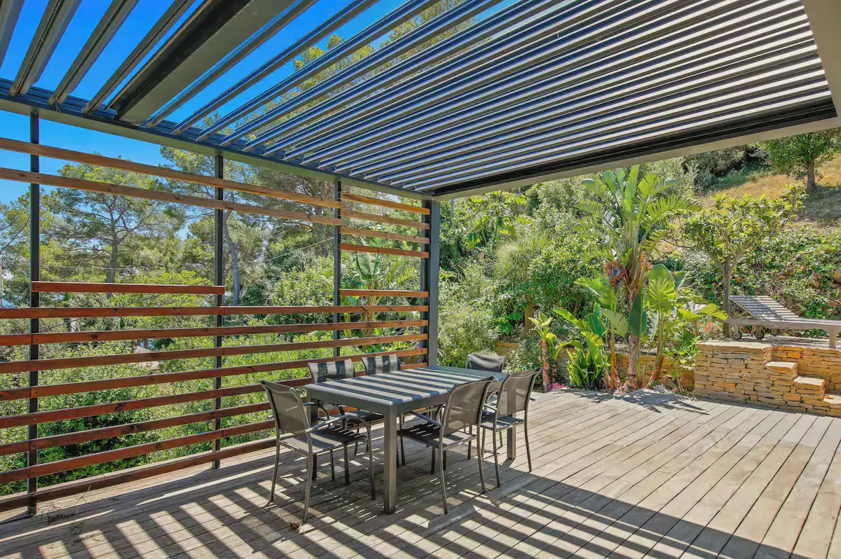 Située à Carqueiranne, cette maison (haut de villa contemporain) offre un cadre rare avec une vue imprenable sur la Méditerranée et les îles, notamment Porquerolles.
